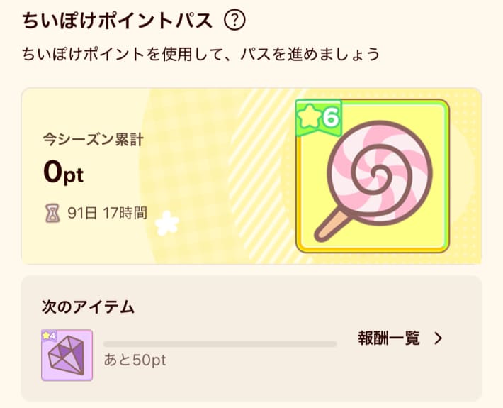 ちいぽけポイントを利用すると、ちいぽけポイントパスという専用のパスが進みます。期間中に使用したちいぽけポイントに応じてゲーム内アイテムや宝石を入手可能です。