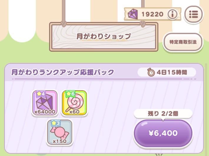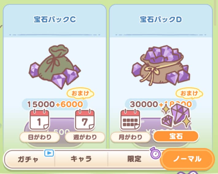 応援パックは日がわり、週がわり、月がわりの3パターンあり、宝石やアメが購入できます。日がわりを複数購入するよりも月がわりを1つ購入した方がお得になるため、長期に渡ってプレイする人におすすめです。