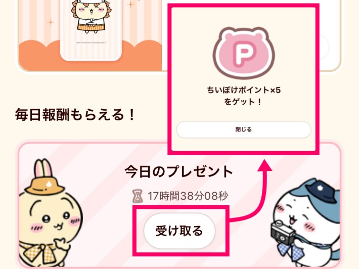 ポイント交換ページの一番下には、タップで報酬が貰えるプレゼントコーナーがあります。1日1回貰えるため、なるべく毎日ログインしましょう。