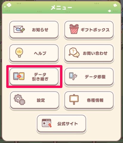 アプリ右上のメニューから「データ引き継ぎ」を選択します。すでにデータ引き継ぎをしている場合は、手順3に進みます。