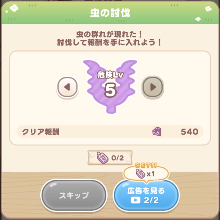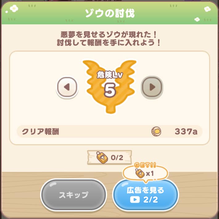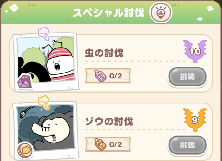 スペシャル討伐で虫やゾウに挑戦するために必要な討伐札は、1日2回まで動画広告の視聴で入手できます。