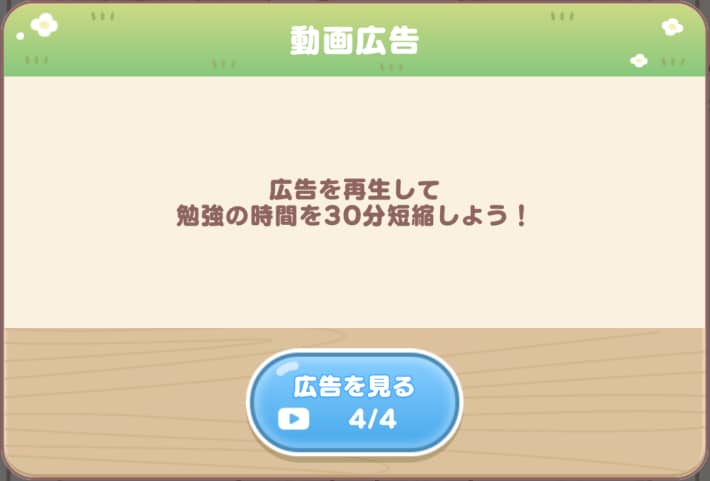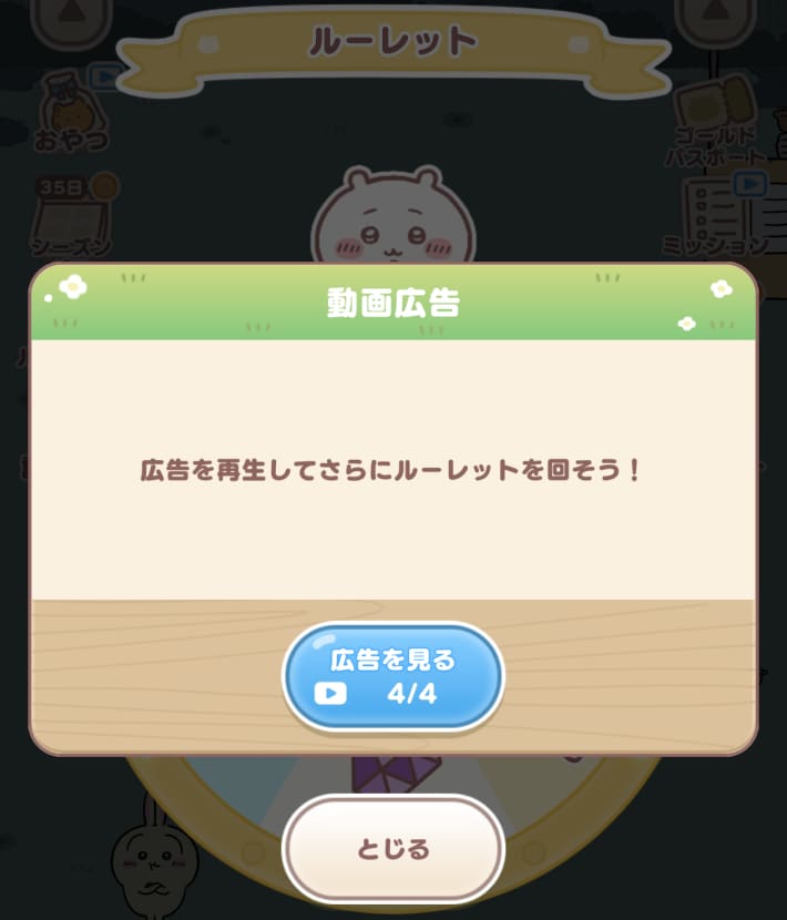 1日4回まで動画広告の視聴でルーレットを回すことができます。5分に1回視聴することが可能なので、ほかの動画広告を見る間にルーレットを挟むのがおすすめです。