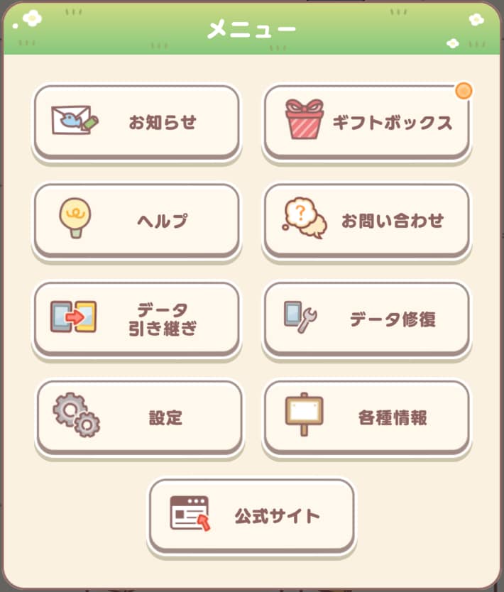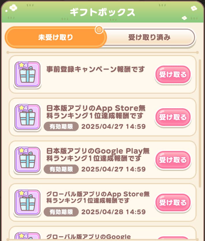 ギフトボックスでは、キャンペーンなどの報酬を受け取ることができます。何かが届いている場合は、メニュー欄のギフトボックスに丸いマークがついているので、毎日確認しておきましょう。