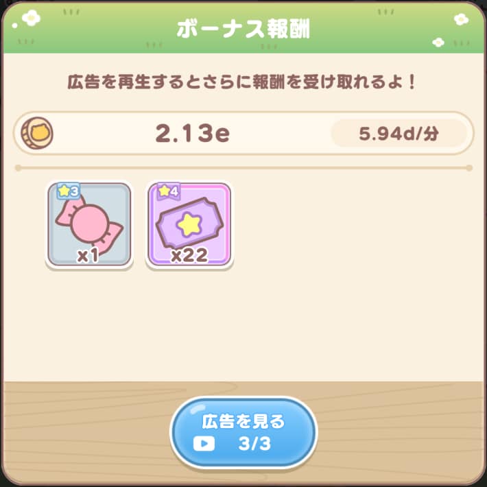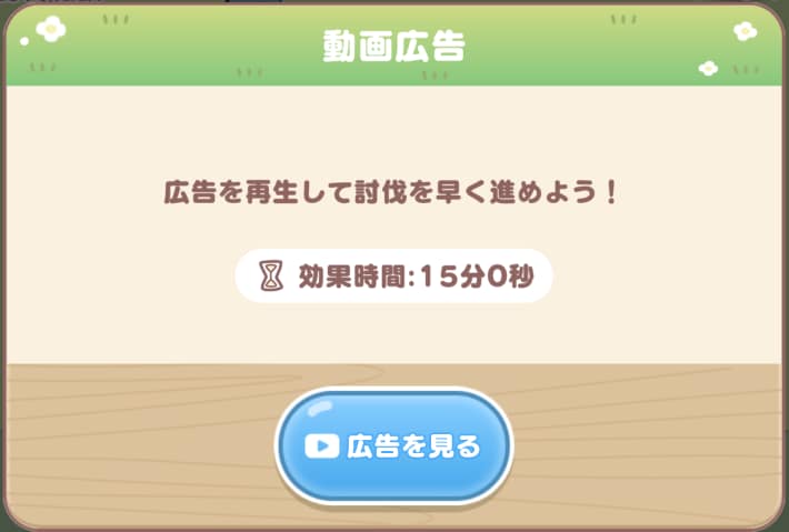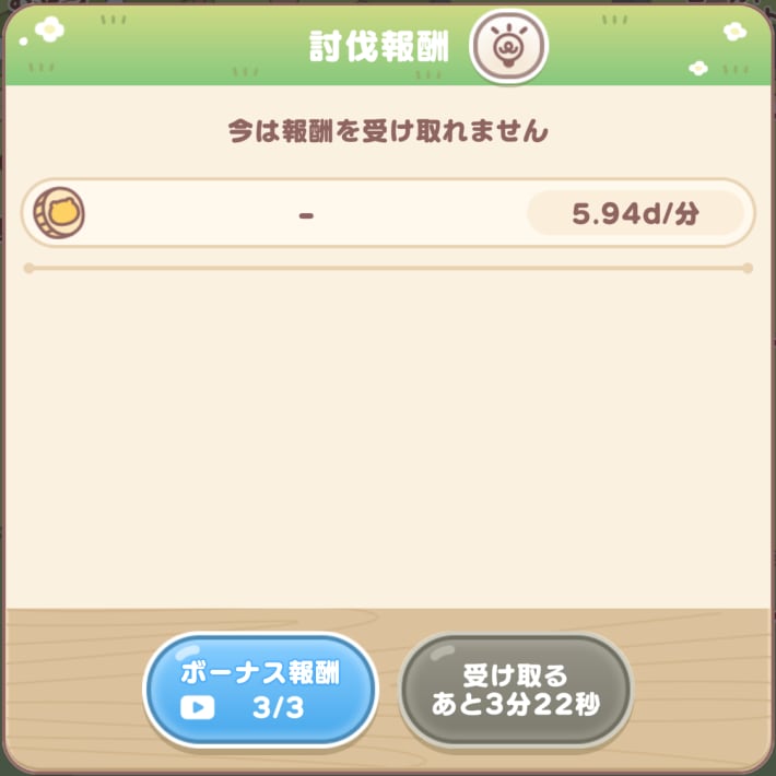 討伐報酬の画面からは、1日3回まで動画広告の視聴でボーナス報酬も受け取ることができます。1時間に1回しか視聴できないので、隙間時間に視聴しましょう。