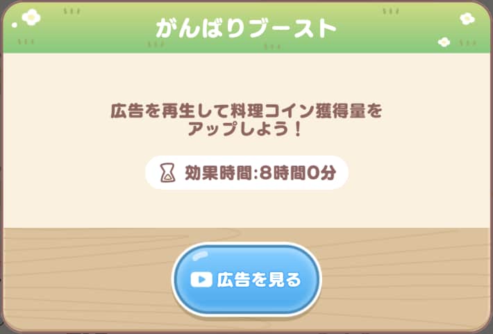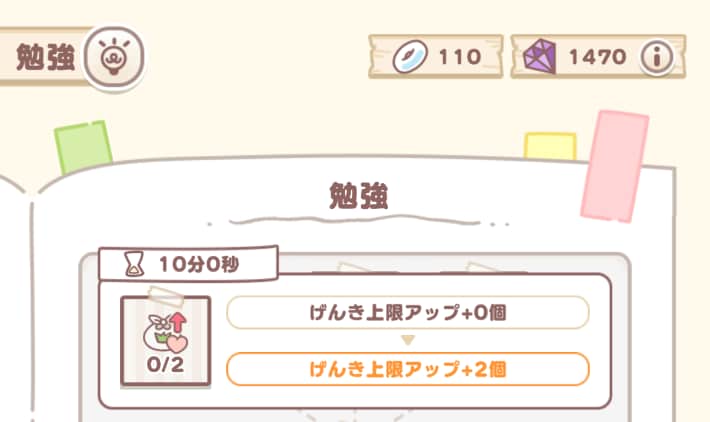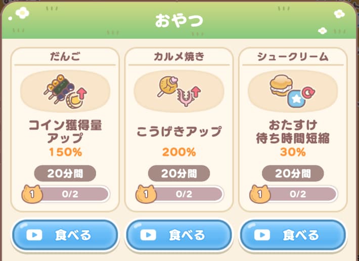 ★★★☆☆ | ・げんきを回復 ・勉強時間を短縮 ・料理コイン獲得量をアップ ・小さいアメを入手 |