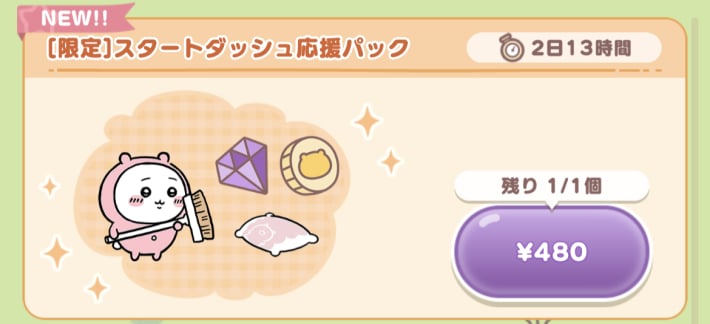 ちいぽけのちいかわ(パジャマ)はショップで購入することで入手できます。「ショップ」から「限定」「いまだけ」と進んで購入しましょう。ただし対象のスタートダッシュ応援パックはゲーム開始から約3日間しか購入できません。