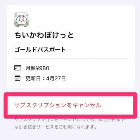 加入しているサブスク一覧の画面にに移動するので、「ちいかわぽけっと」を選択し、「サブスクリプションをキャンセル」を選択すると解約できます。