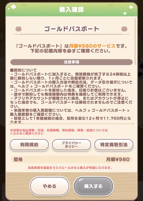 ちいぽけで初めて課金する際は、購入前に生年月日の入力画面になります。生年月日を入力後、再度「購入する」を押すことで、ゴールドパスポートの購入が可能です。