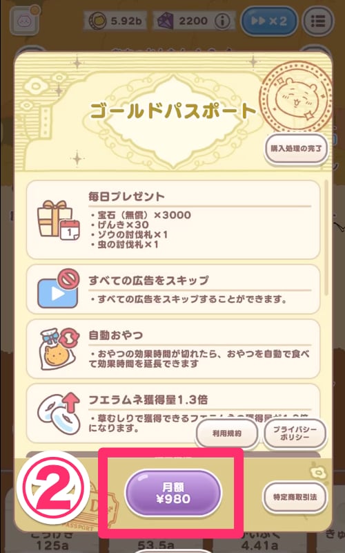 ホーム画面などの右上にある「ゴールドパスポート」のアイコンを押します。ゴールドパスポートの詳細画面が出るので、下の「月額」ボタンを押しましょう