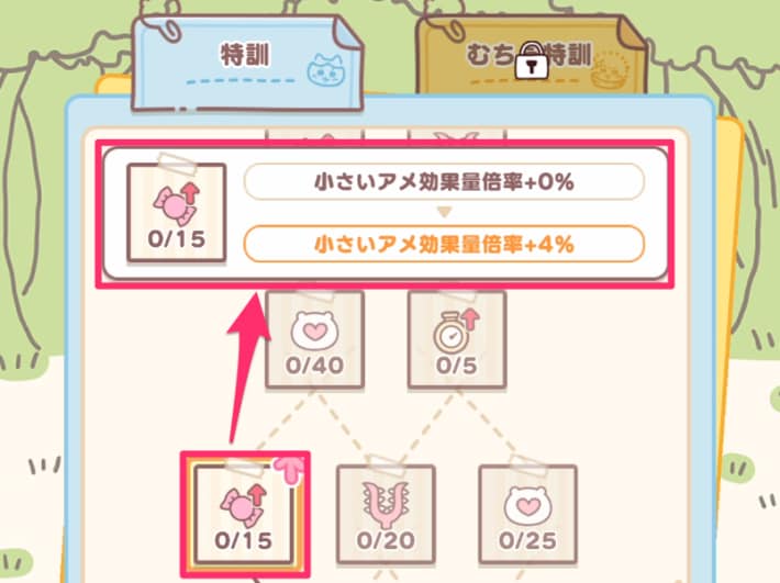 特訓ではアメの効果量倍率アップのマスを優先して解放するようにしましょう。ちいぽけでは衣装レベル上げに必要な小さなアメが大量に必要になるため、小さなアメの効果量を上げておくと良いです。