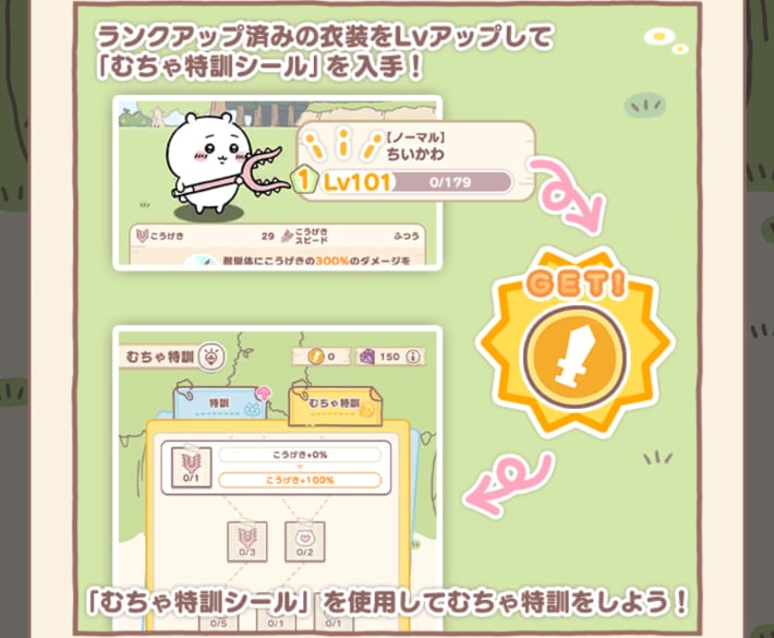 ちいぽけの特訓のやり方とメリットです。ちいかわポケット特訓の必要アイテムやむちゃ特訓の解放条件、特訓シールの集め方を掲載。特訓の際にお役立て下さい。