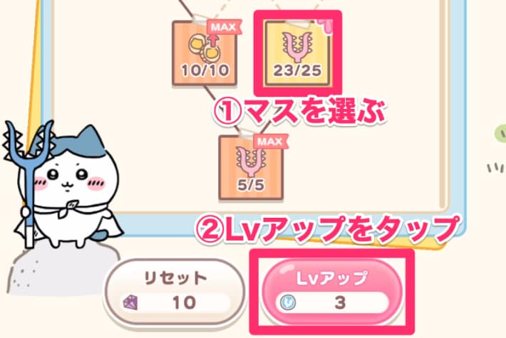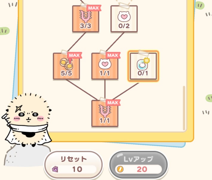 次のマスの解放には手前のマスの最大強化が必要になってきます。そのため、こうげきアップを全て上げようとすると満遍なく特訓する必要があります。