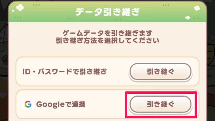 連携したアカウントから「引き継ぐ」をタップするとデータが引き継げます。