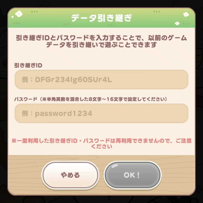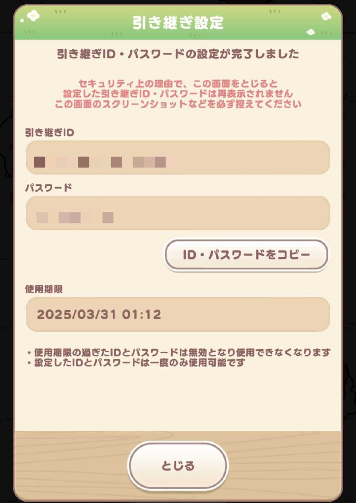 引き継ぎIDとパスワードが合わせて発行されるので、コピーやメモを取っておきましょう。