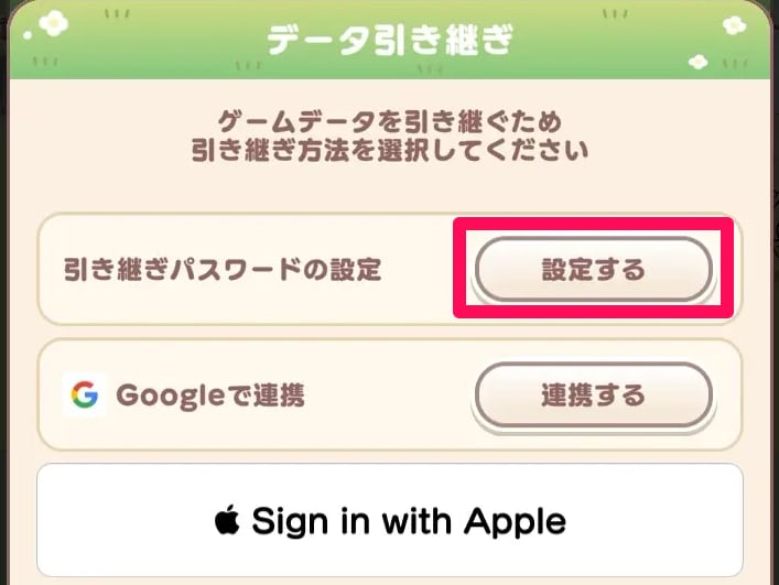 「引き継ぎパスワードの設定」を選択し、パスワードを設定します。