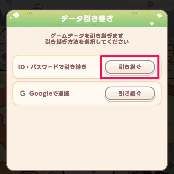 「ID・パスワードで引き継ぎ」を選択し、発行したIDとパスワードを入力すれば引き継ぎ完了です。