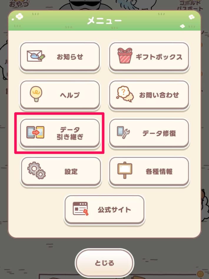 画面右上からメニューを開き、データ引き継ぎを選択します。