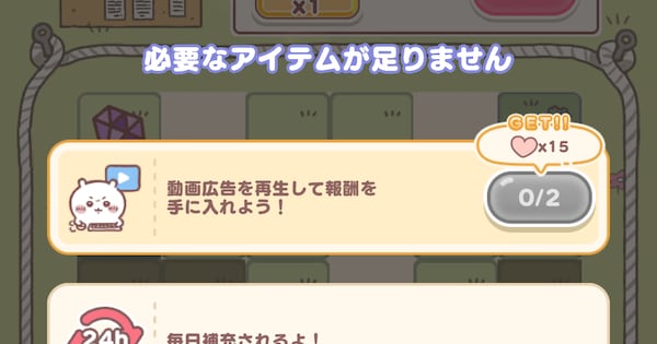 | ▼動画広告再生 | 1再生につきげんき15個分回復 ※1日2回まで可能 |