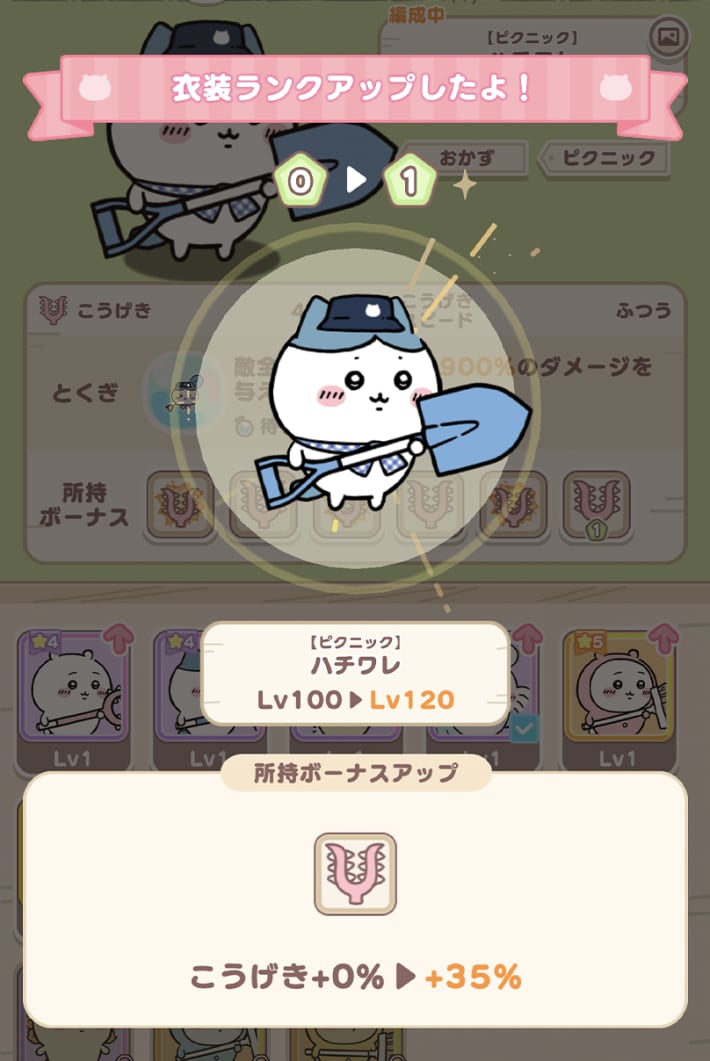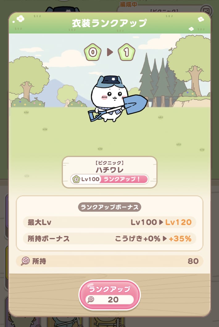 大きいアメは、衣装レベルが100レベルに到達した衣装のランクアップ(上限解放)に使用します。1回のランクアップに20個〜使用する上に、入手手段が限られているので、お気に入りのキャラや所持ボーナス目当てのキャラに優先して使いましょう。