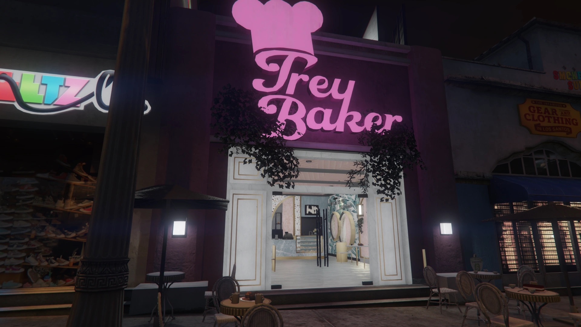 「Trey Baker」と大きく書かれたピンク色のネオンが、店舗入り口の上で存在感を放っています。