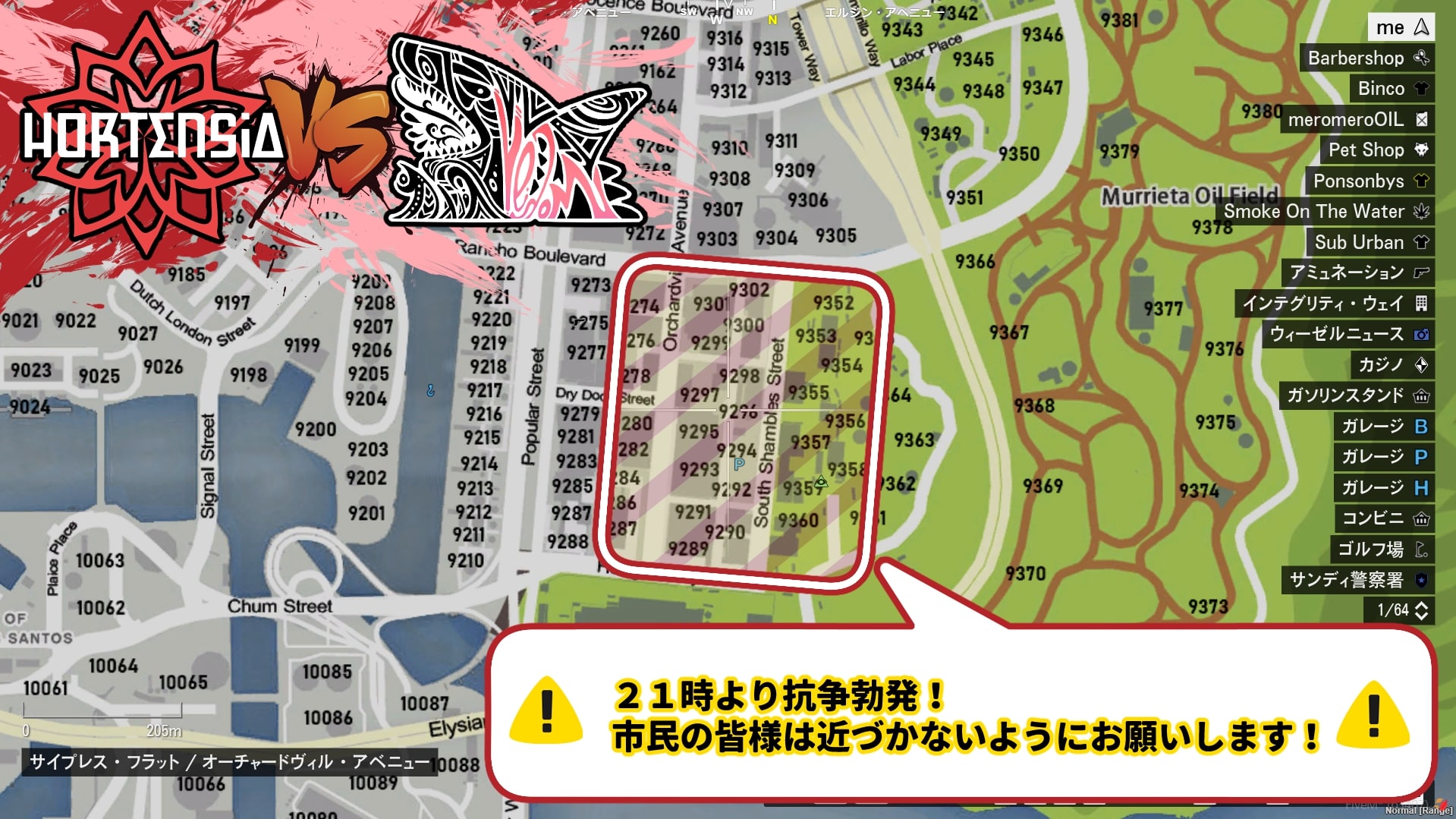 3月1日(土)21:00より、ギャング団『HORTENSIA』と『VENOM』の間で抗争が発生する恐れがあります。