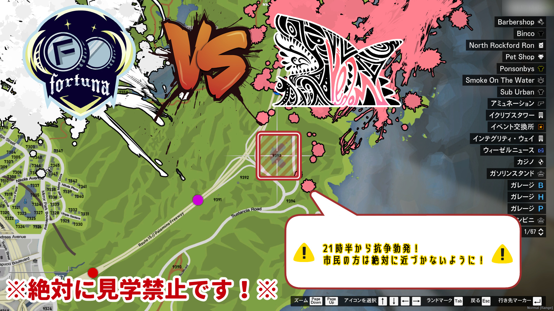 8月2日(土)21時30分頃、9393番地付近にてギャング同士による抗争が発生する見込みです。