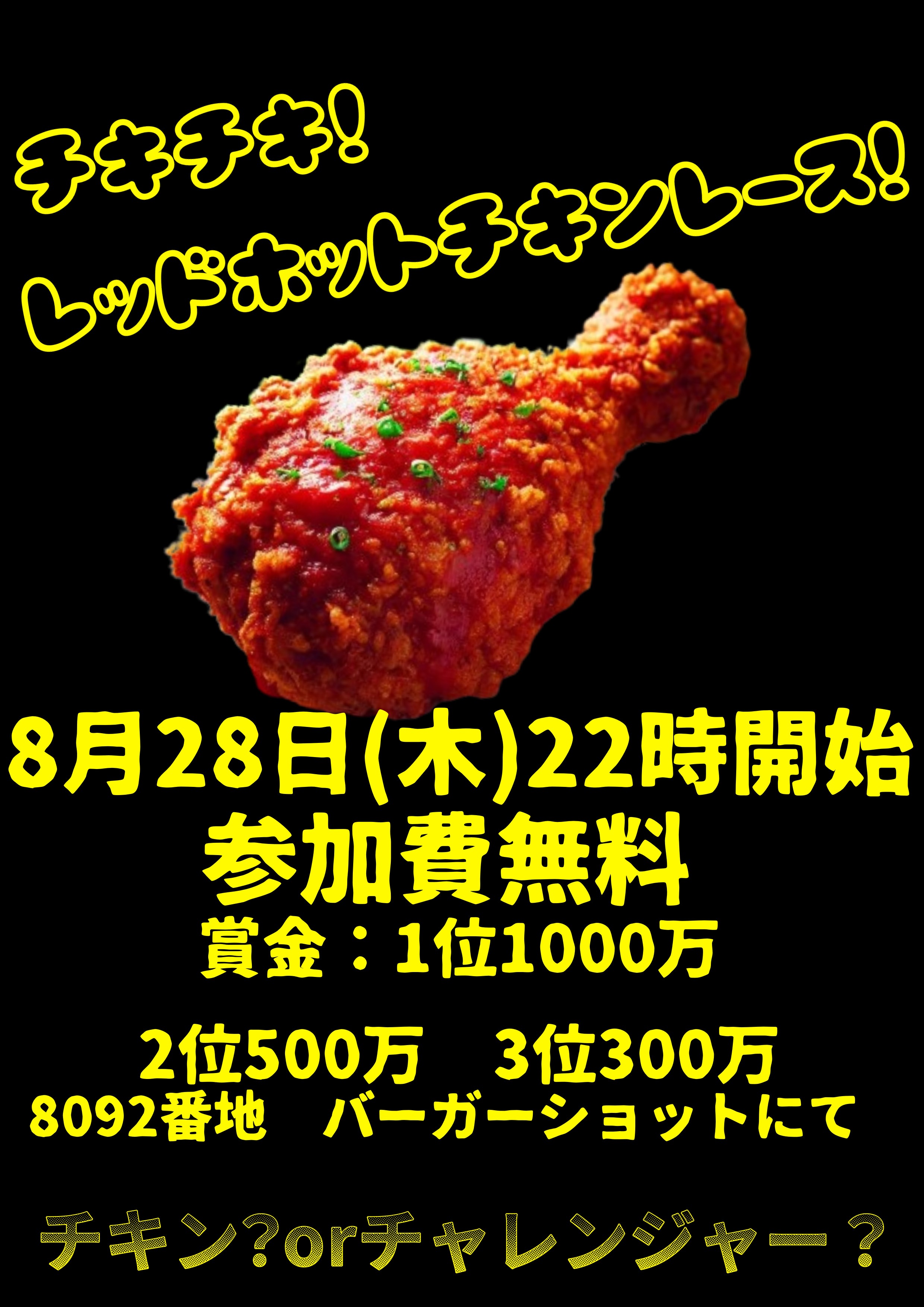 レッドホットチキンレースとは、このチキンを幾つまで食すことが出来るかを競うゲームである。