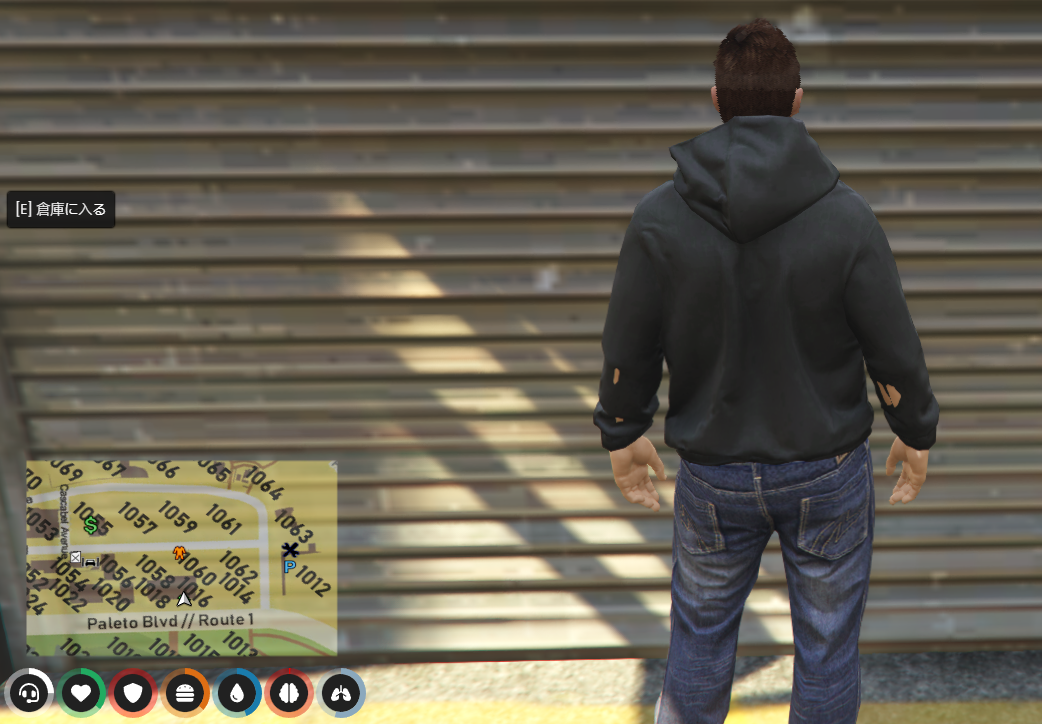 7.退場する際は倉庫内シャッターに近付きEキーで退場する