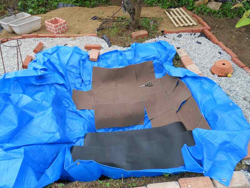 ブルーシートと、タイルカーペットで木の根や石ころでプールライナーに穴があかないように保護する。