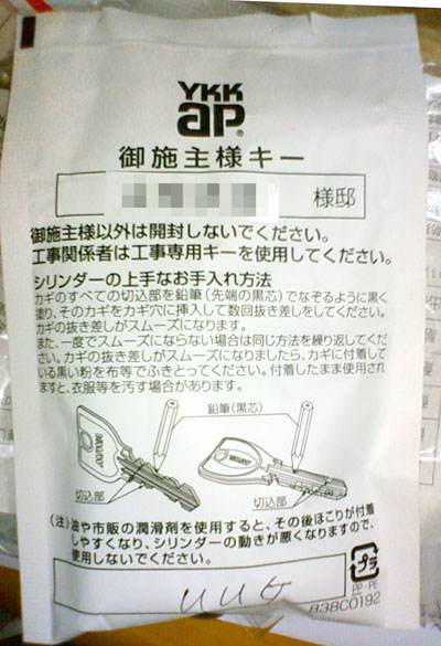 工事中玄関キーは、工事用キーであったが、引き渡し後は本キーをもらう。