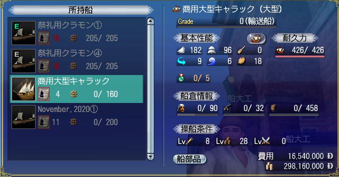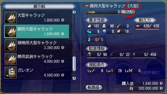 - 目指す船型式の船(移動用として使いたいなら探検船、交易品たくさん運びたいなら輸送船、など)