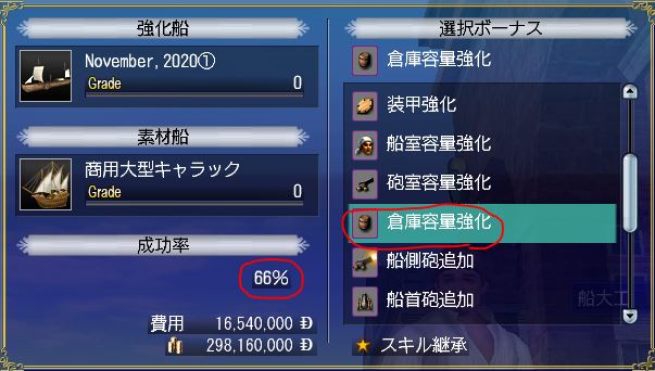 - Grade 1に上がった時に欲しいボーナスを選択。同時に、船の指定を間違えてないか、成功率や費用なども確認