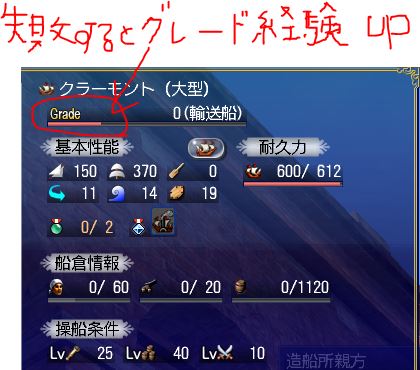 - グレード経験値を上げるアイテム「大型船なんちゃら設計図」なんていうのもありますが、お値段高い割にあんまりグレード上がらないので、アイテム使わず根気を使う、でいいと思います