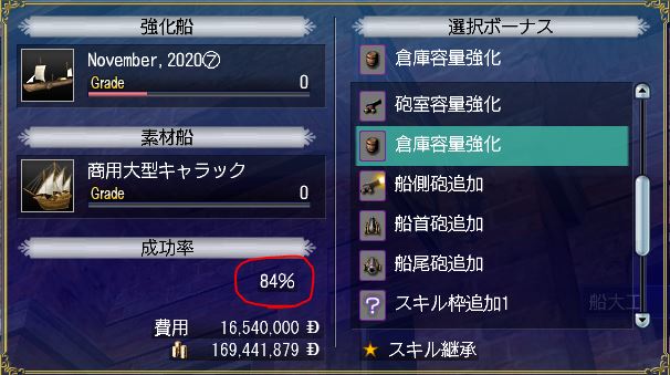 - 失敗した船で再度やってみると、今度は成功率が66%から84%にUPしています