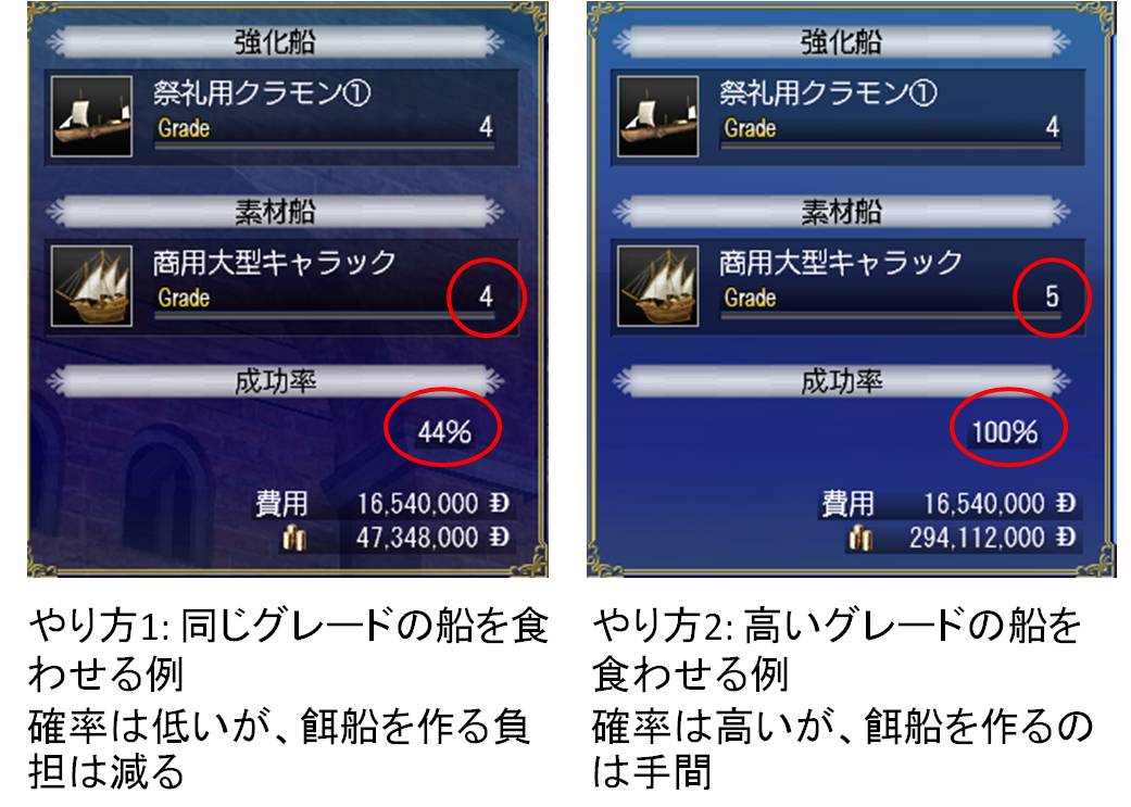 - やり方1: 同じグレードの船を食わせるやり方→餌船の用意は楽だが、成功率はイマイチ