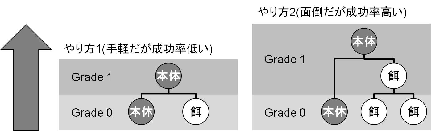 - Grade 0から1に上がる時などは、成功率はもともと高いし、失敗しても痛くないので、やり方1で良いです