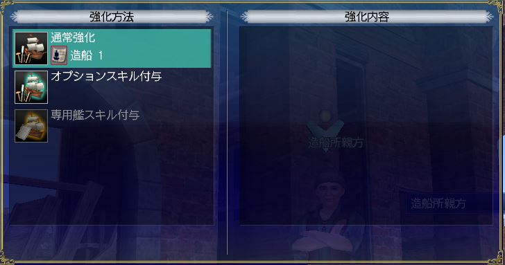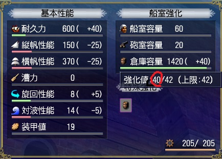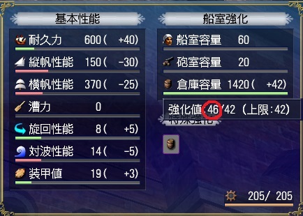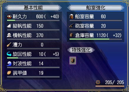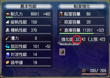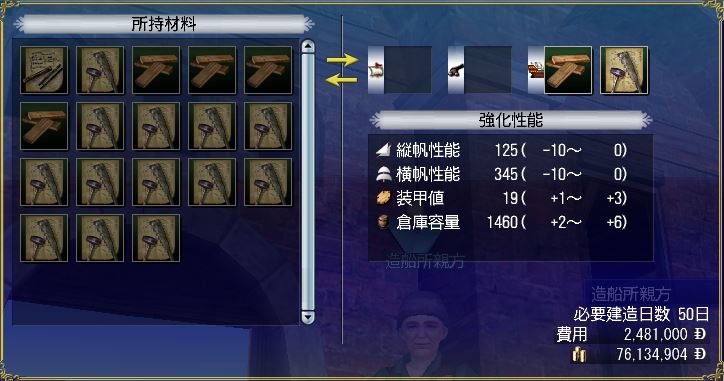 - 造船所親方に強化を依頼して上げれる要素は、耐久、縦帆、横帆、漕力(ガレーのみ)、旋回、対波、装甲、船室、砲室、倉庫です