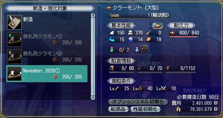 - こちらが、シップリビルドと操船熟練度上げが完了したクラーモントです