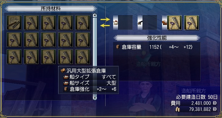- クラーモントは大型船なので、wiki情報から、大型船の倉庫を強化するには、東アジア貿易船倉、汎用大型拡張倉庫、工作室、貯蔵庫、金庫、調理室が使えることが分かりました