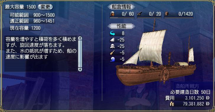 - ペナルティを考慮する以外に、数値としては見えないけど、船は容量が大きいほど遅くなり、容量を削るほど速くなります。速い船に浪漫を感じる人たちは、ほとんど何も積めないぐらいにガリガリ削っていきますw