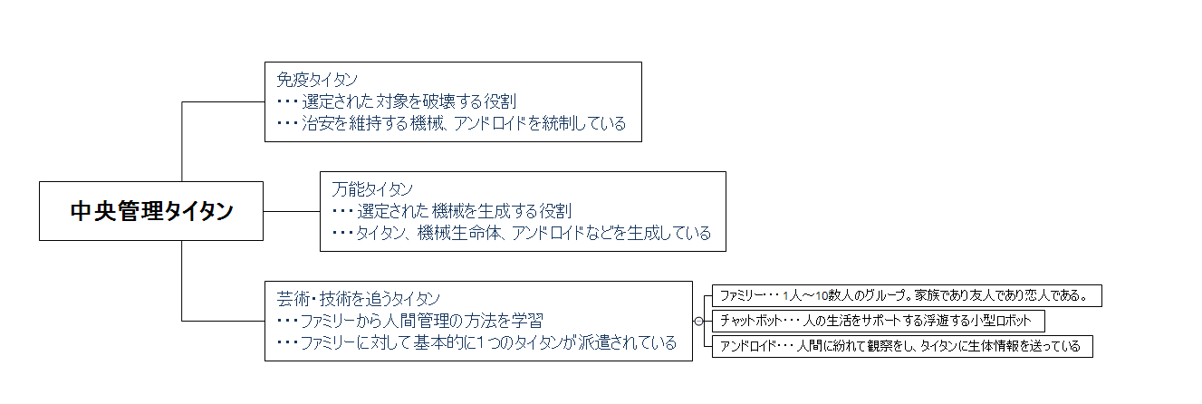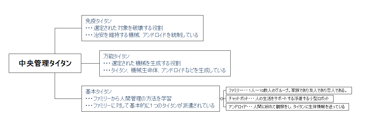 ◆宇宙開発が進み、人類は月面基地を作り、太陽系の散策を行って物資を確保することが当たり前になった。それから人工知能の開発が進み、自立型の管理AIタイタンが複数誕生するようになる。建築、交通、食事、衣類、医療、福祉、エンターテイメント等、様々な分野で自立して生産を行えるようになった。そして、タイタンたちは生活が約束された管理区域を作り出した。人類の多くがその区域へと移住して生活をすることになった。