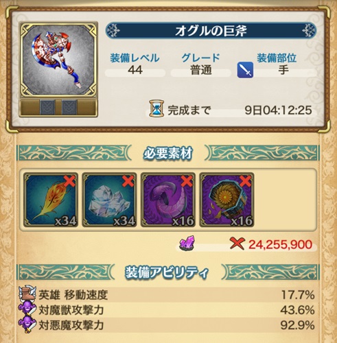 アビリティ | 英雄移動速度 17.7% 対魔獣攻撃力 43.6% 対悪魔攻撃力 92.9% |