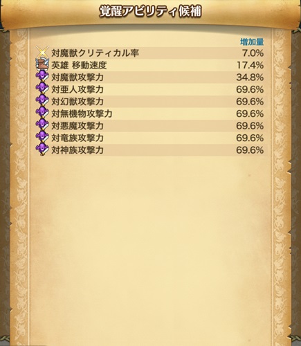 英雄移動速度 26.5% 対魔獣攻撃力 65.4% 対悪魔攻撃力 139.3% |