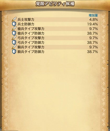 弓兵タイプ攻撃力 28.0% 弓兵タイプ防御力 125.0% 運搬力 18.8% |