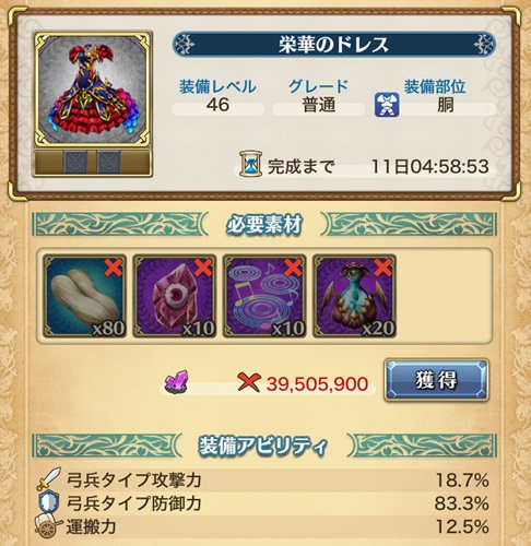 必要素材 | 高級繊維×80 魔魂核×10 海音女の歌声×10 甘苦の瘴気×20 |