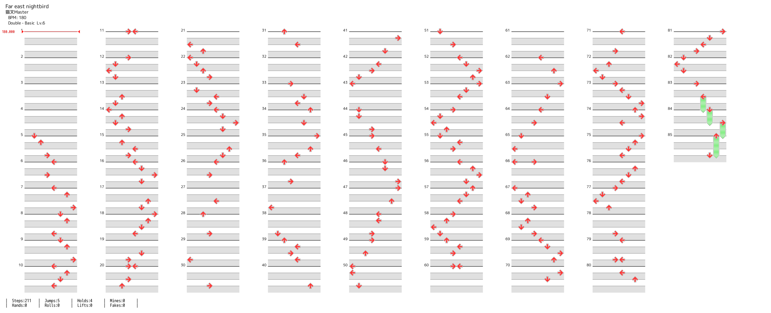 - 楽のみ1Pサイドスタート。4分は短く同時は僅か、FAもラストにしかないが渡りが頻発する譜面。80ノーツ目が1P↑の遠距離渡りなのでMFC狙い時は注意 -- 名無しさん (2016-09-29 23:02:15)