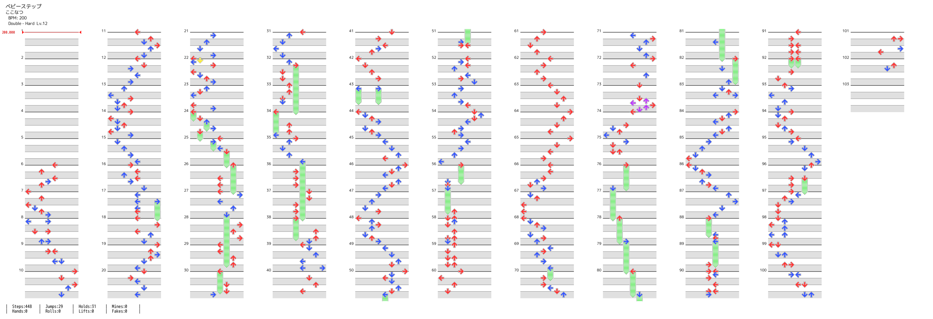 - 全譜面共通ホームポジションスタート。ESPと同じく16分3連も8分同時も12分7連も健在で、渡りもDP相応にあるが踊よりは多少軽減されている。FA軸もあるので交互にしっかり踏んで高BPMに備えたいところ。 -- 名無しさん (2020-01-15 22:50:43)