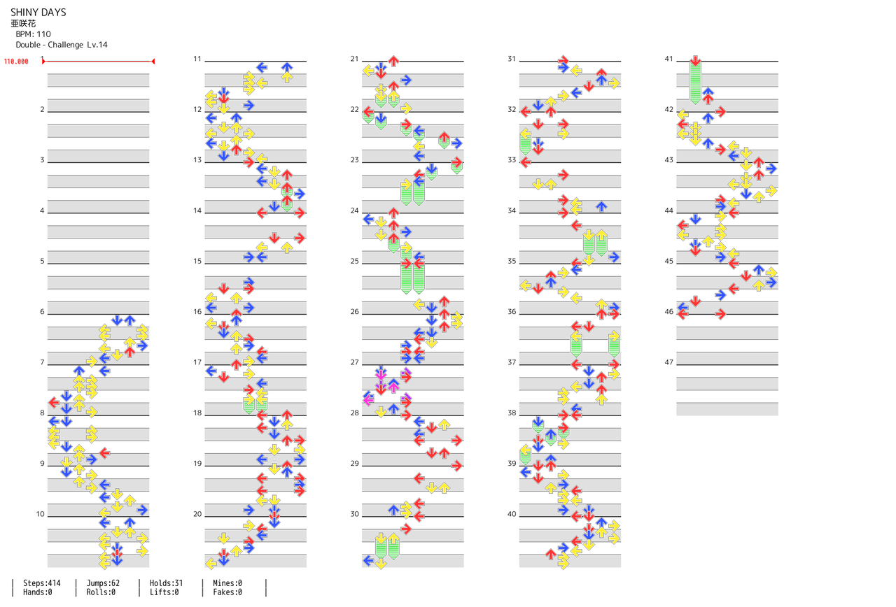 - 16分中心、片足いじめ、2パネル跨いだ捻り戻しなど響きは難しそうなのだが非常にゆったりとしたBPMなので踏みやすく、練習にもなる。イマイチ弾めなかった激と違い気持ち良く踏ませてくれる良譜面。 -- 名無しさん (2022-08-17 10:14:47)