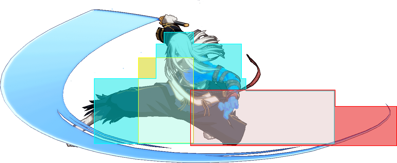 前方に高速移動し、相手を追い越しながら相手を斬りつける。移動中は相手をすり抜ける。発生15F。7Fから飛び道具無敵。●Fから投げ無敵。
