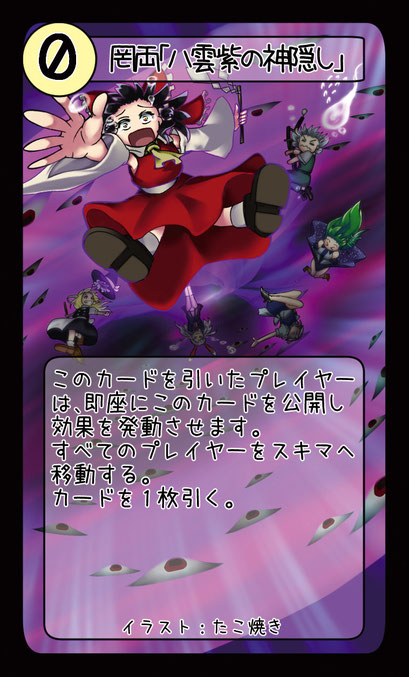 このカードを引いたプレイヤーは、即座にこのカードを公開し効果を発動させます。 すべてのプレイヤーをスキマへ移動する。 カードを1枚引く。 |